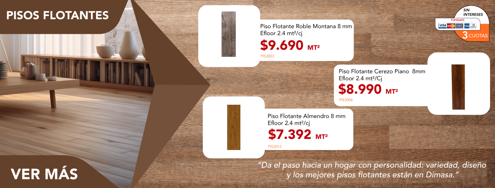 Destacado SKU: PIS3012 Piso Flotante Efloor 8Mm Almendro 2.4M2/Cj $23.975 $17.774 Retiro disponible Despacho disponible Agregar